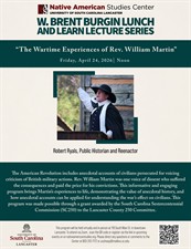 The American Revolution includes anecdotal accounts of civilians persecuted for voicing criticism of British military actions. Rev. William Martin was one voice of dissent who suffered the consequences and paid the price for his convictions. This informative and engaging program brings Martin’s experiences to life, demonstrating the value of anecdotal history, and how anecdotal accounts can be applied for understanding the war’s effect on civilians. This program was made possible through a grant awarded by the South Carolina Sestercentennial Commission (SC250) to the Lancaster County 250 Committee.