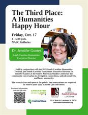 Held in conjunction with the 2025 South Carolina Humanities Festival, join South Carolina Humanities Executive Director Dr. Jennifer Gunter at the Native American Studies Center for this community conversation to strengthen connections, unleash creativity, and foster prosperity. The event is free and open to the public, but reservations are required. To reserve your spot, visit https://schumanities.org/annualevents/humanitiesfestival/